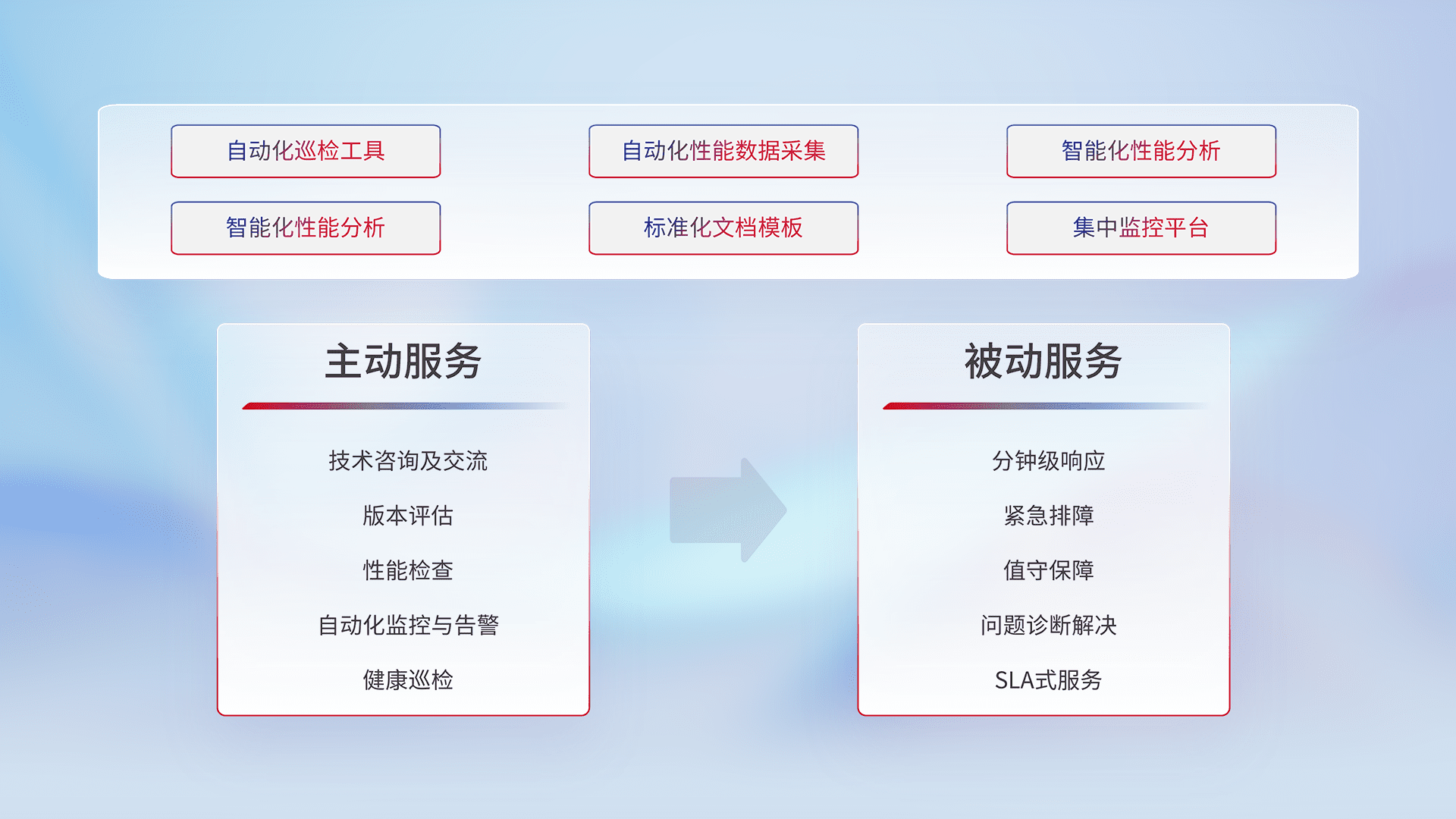 智能化工具和标准化文档,,,,保障服务质量,,提供主动服务(包含技术咨询、、、版本评估、、、、性能检查、、自动化监控与告警、、、、健康巡检)和被动服务包含(分钟级响应、、、紧急排障、、值守保障、、、问题诊断解决、、、SLA服务)。。